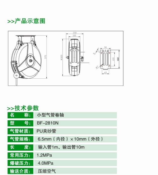 BF-2810N | 常用压力1.5MPa,爆破压力:4.5MPa ,可输送介质:压缩空气,管规格6.5mm×10.0mm×10M,材质:PU夹纱管,产品外壳颜色可选:灰、蓝、黄、红色。(可做:8.0mm×12.0mm×15M,10.0mm×14.0mm×10M) | ||||