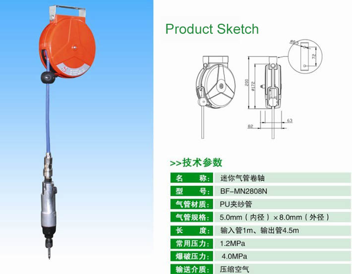 常用压力1.2MPa, 爆破压力:3.6MPa 气管规格:5.0mm×8.0mm×4.5M,材质:PU夹纱管 可输送介质:压缩空气 产品外壳颜色可选:灰、蓝、黄、红色。 |